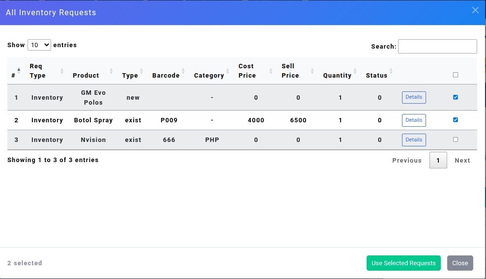 Sebuah modal akan menampilkan daftar produk yang telah direquest jika pernah dilakukan