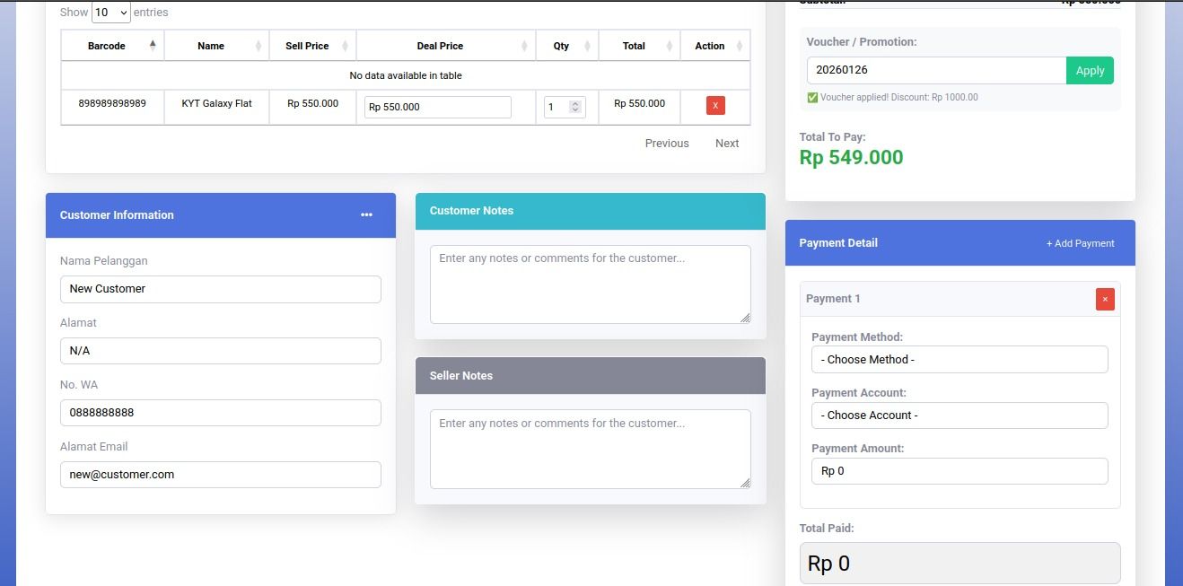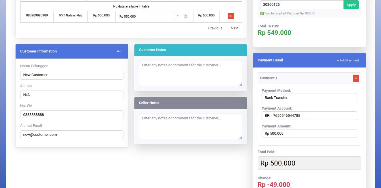 Setelah produk dimasukan ke invoice penjualan, dan customer telah ditentukan dan penggunaan voucher telah dilewati