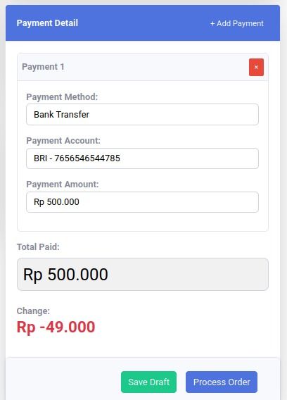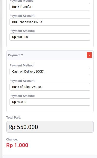 Pembayaran dapat dilakuakn secara terpisah atau multiple, misal sebagian dengah Cash dan sebagian dengan Transfer atau Kartu Kredit
