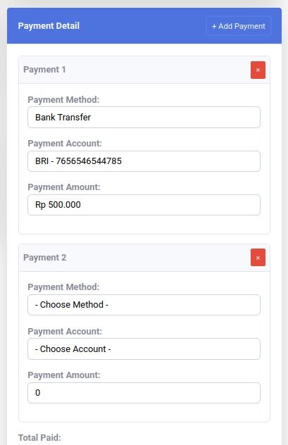 Pada Payment Detail, klik tombol + Add Payment, maka akan tersedia bagian Payment 2