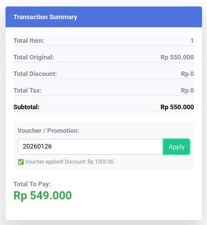 Jika Voucher yang diinput valid, maka system secara otomatis akan memberikan harga diskon sesuai voucher